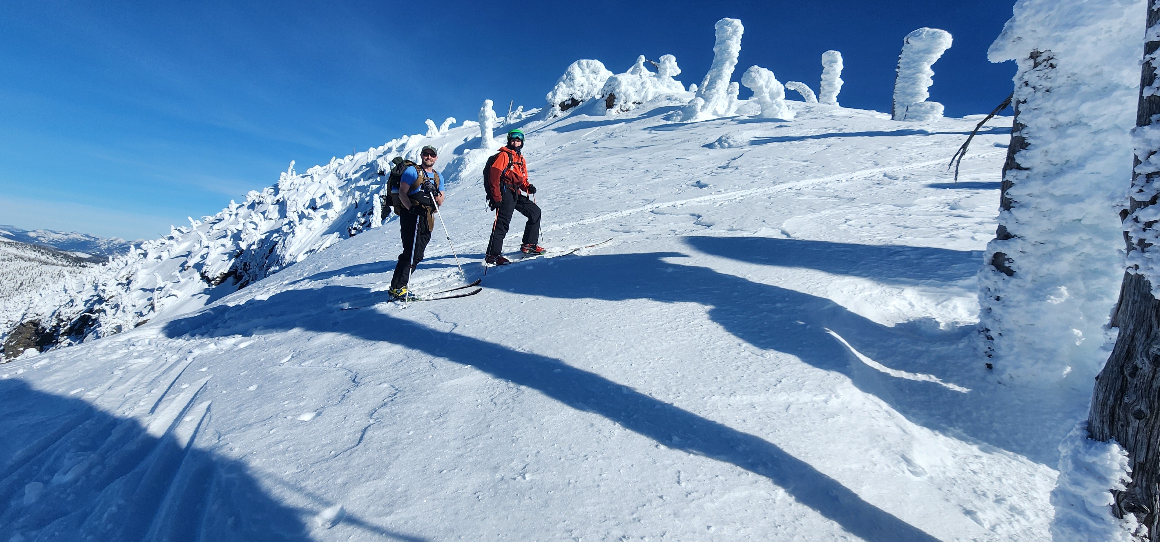 On BC101 or Advanced tours we can use the snowcat to get to 6,000 ft and higher. We park it and go on tour only ascending 200 ft to summit Atlasta. When we do take our laps, we usually keep them to 500–800 ft vertical – much shorter than a normal snowcat run – because we either turn around when the snow changes or don’t want to extend the descent – and, therefore, the skin back up – too long. At the end of the day with a Snowcat Bump, the tail-guide will to drive the cat to a pick-up point along the snowcat road before the last ascent. The group then gets a long last run right to the cat. From the cat we will transfer to sleds to return to the parking area.